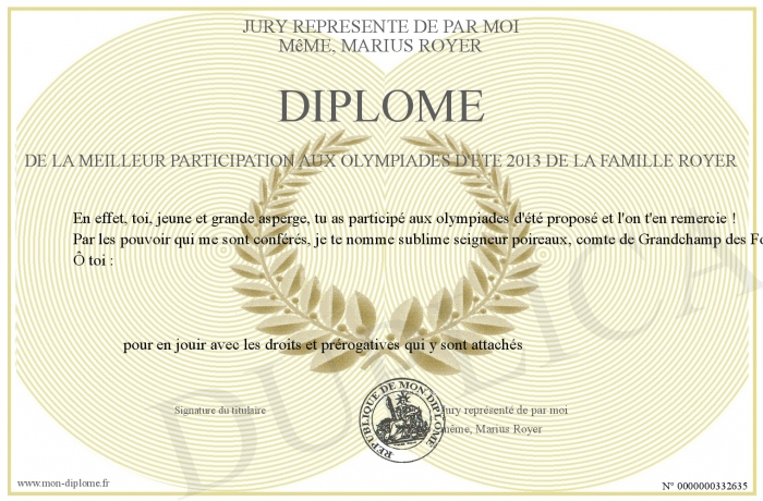 Envoyez par email votre Diplôme de la meilleur participation aux Olympiades d'été 2013 de la famille Royer personalisé