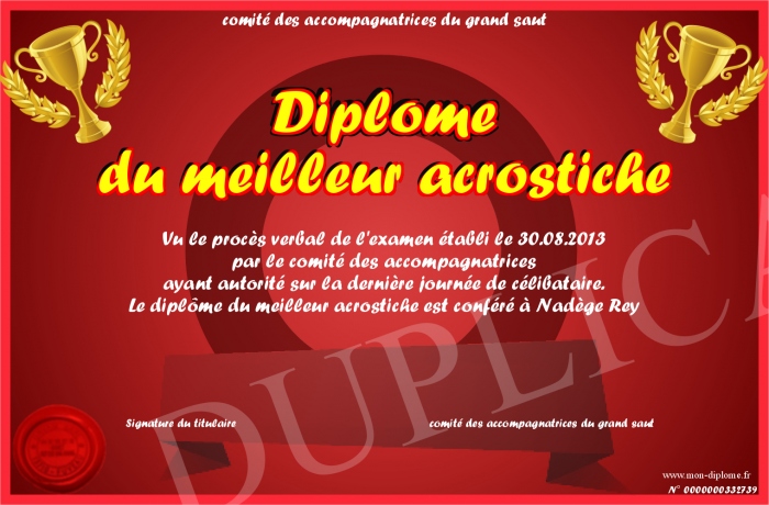 Envoyez par email votre Diplôme du meilleur acrostiche personalisé