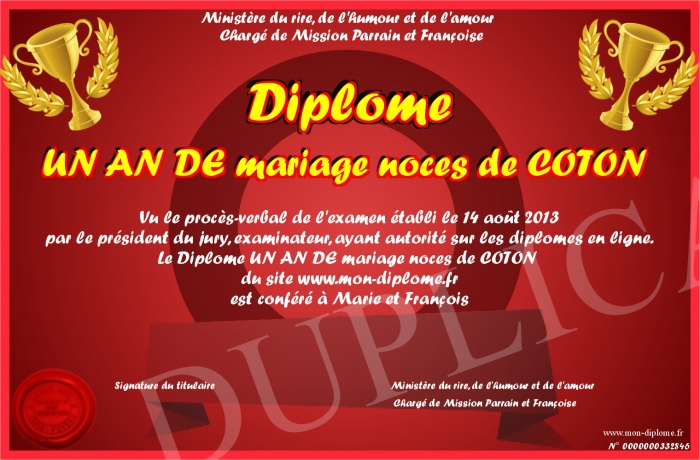 Envoyez par email votre Diplome UN AN DE mariage noces de COTON personalisé