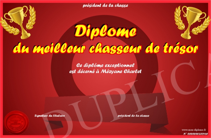Envoyez par email votre Diplôme du meilleur chasseur de trésor personalisé