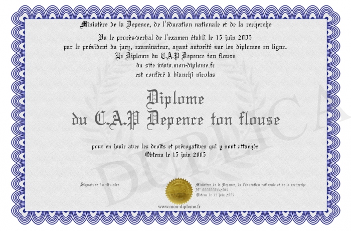 Envoyez par email votre Diplôme du C.A.P Depence ton flouse personalisé
