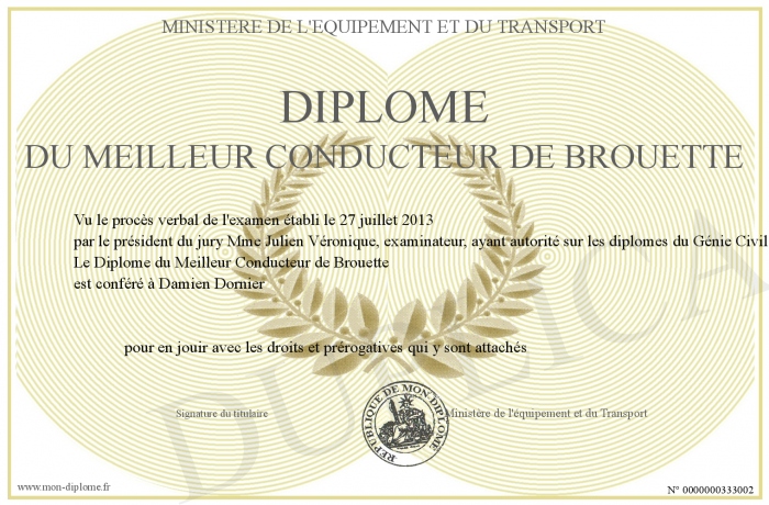 Envoyez par email votre Diplôme du Meilleur Conducteur de Brouette personalisé