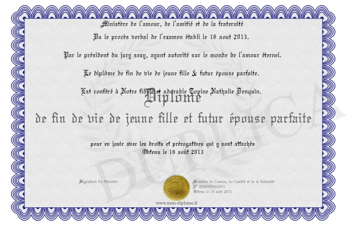 Envoyez par email votre Diplôme de fin de vie de jeune fille et futur épouse parfaite personalisé