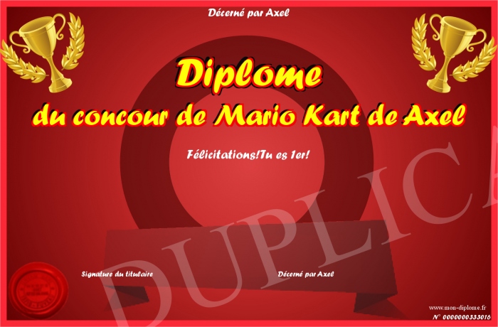 Envoyez par email votre Diplôme du concour de Mario Kart de Axel personalisé