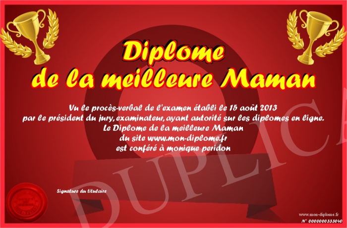 Envoyez par email votre Diplome de la meilleure Maman personalisé