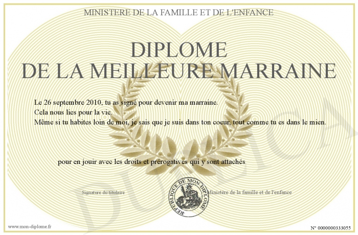 Envoyez par email votre Diplôme de la meilleure marraine personalisé