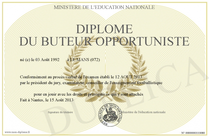 Envoyez par email votre Diplôme du buteur opportuniste personalisé