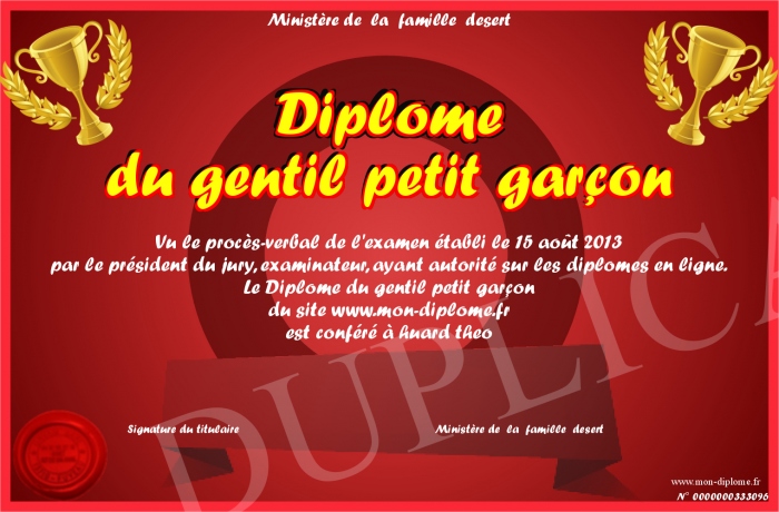 Envoyez par email votre Diplôme du gentil petit garçon personalisé