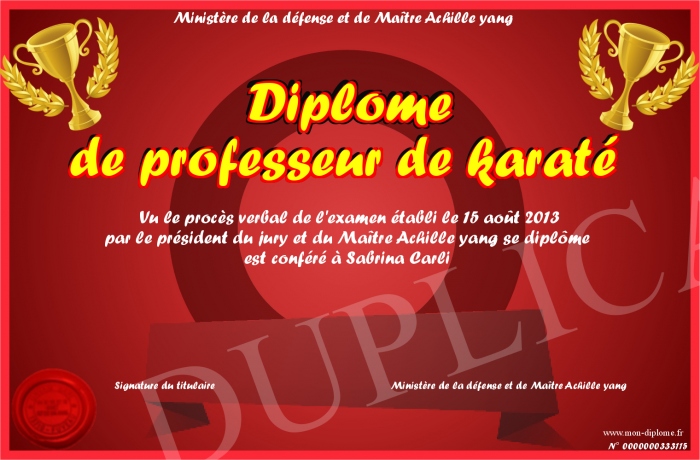 Envoyez par email votre Diplôme de professeur de karaté personalisé