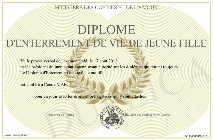 Envoyez par email votre Diplome d'Enterrement de vie de jeune fille personalisé
