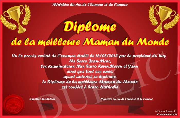 Envoyez par email votre Diplome de la meilleure Maman du Monde personalisé