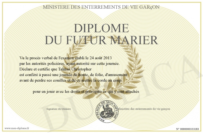 Envoyez par email votre Diplôme du futur marier personalisé