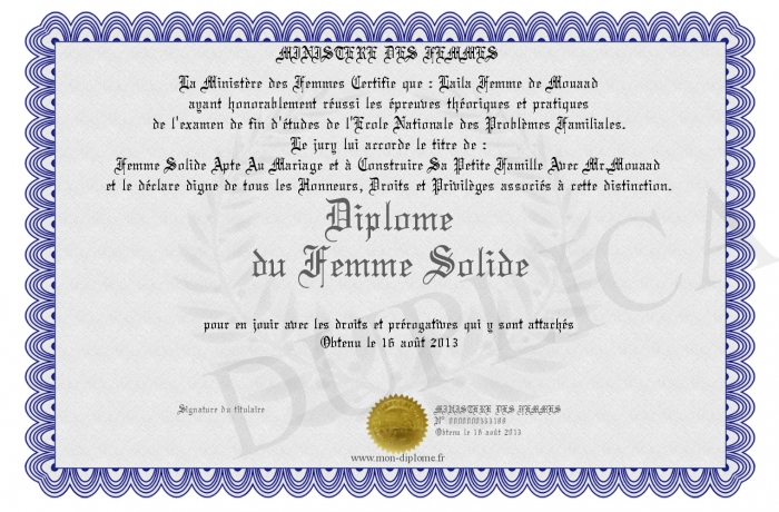 Envoyez par email votre Diplôme du Femme Solide personalisé