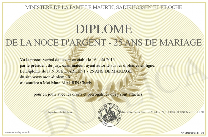 Envoyez par email votre Diplôme de la NOCE D'ARGENT - 25 ANS DE MARIAGE personalisé