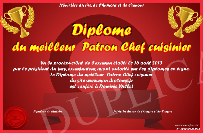 Envoyez par email votre Diplome du meilleur Patron Chef cuisinier personalisé