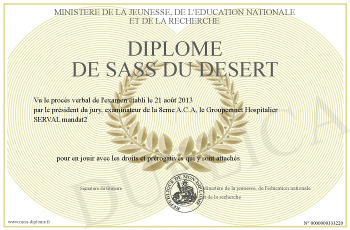 Envoyez par email votre Diplôme de SASS du Désert personalisé