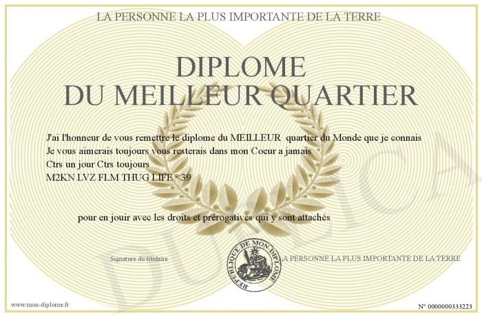Envoyez par email votre Diplôme du MEILLEUR QUARTIER personalisé