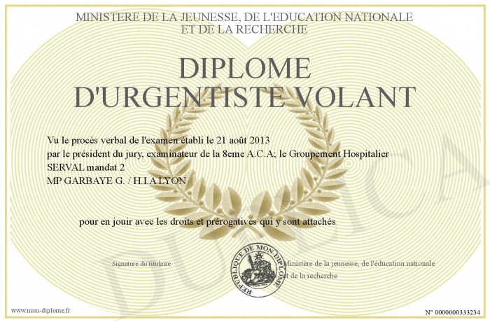 Envoyez par email votre Diplome d'Urgentiste Volant personalisé