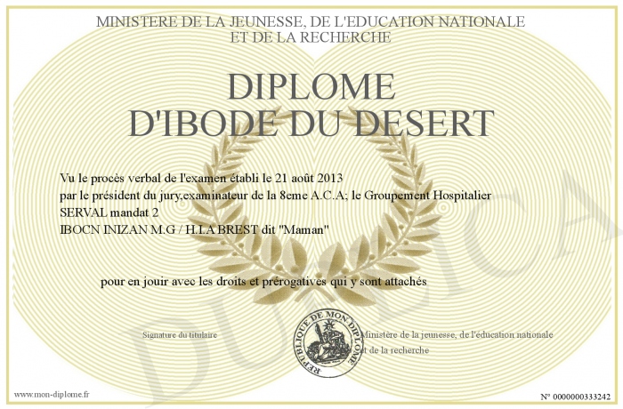 Envoyez par email votre Diplome d'IBODE du désert personalisé