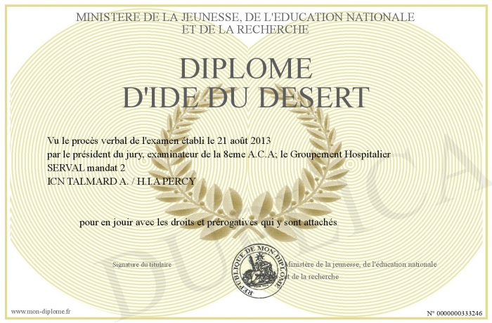 Envoyez par email votre Diplome d'IDE du Désert personalisé