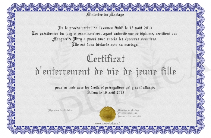Envoyez par email votre Certificat d'enterrement de vie de jeune fille personalisé