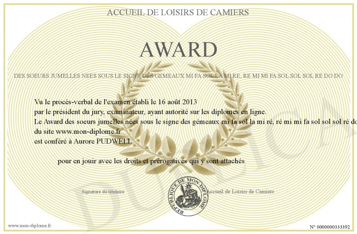 Envoyez par email votre Award des soeurs jumelles nées sous le signe des gémeaux mi fa sol la mi ré, ré mi mi fa sol sol sol ré do do personalisé