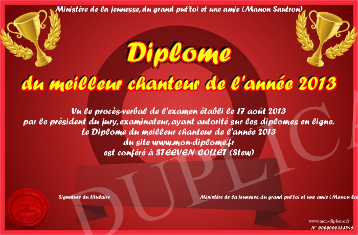 Envoyez par email votre Diplôme du meilleur chanteur de l'année 2013 personalisé
