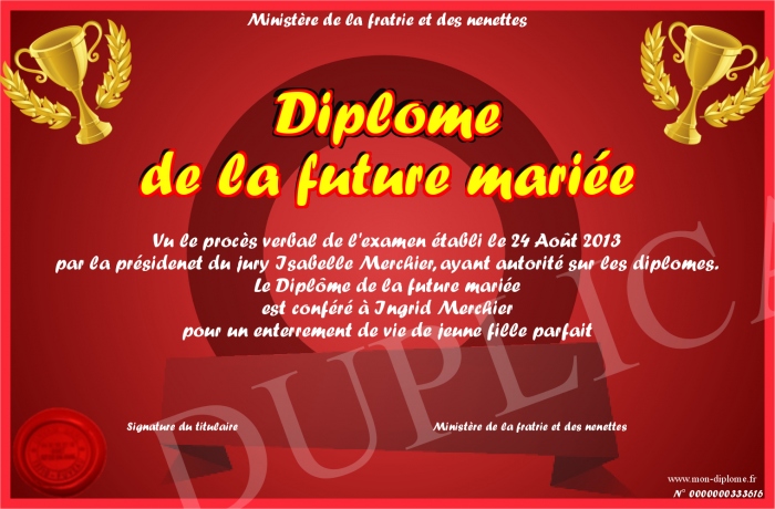 Envoyez par email votre Diplôme de la future mariée personalisé