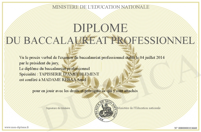 Envoyez par email votre diplôme du baccalauréat professionnel personalisé
