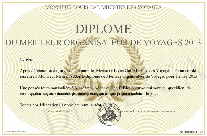 Envoyez par email votre Diplôme du Meilleur Organisateur de Voyages 2013 personalisé