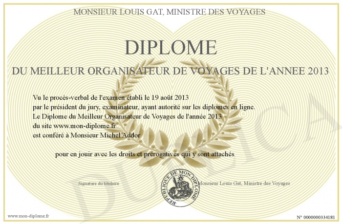 Envoyez par email votre Diplôme du Meilleur Organisateur de Voyages de l'année 2013 personalisé