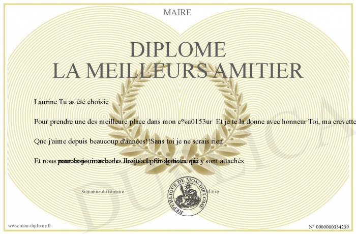 Envoyez par email votre Diplôme la meilleurs amitier personalisé