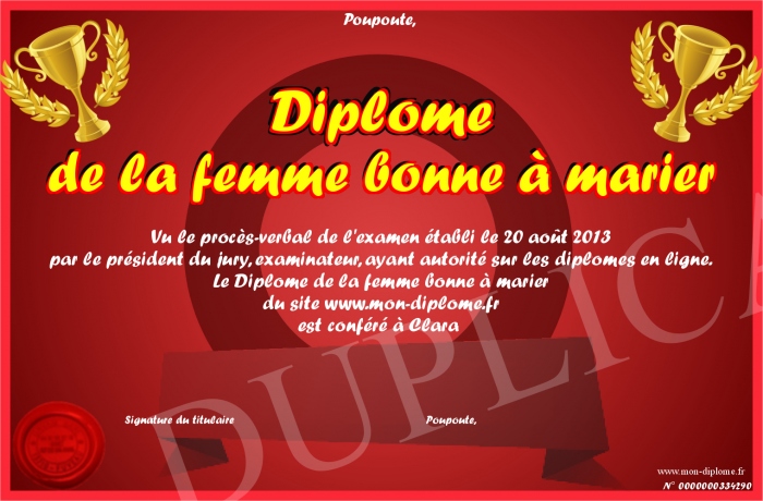 Envoyez par email votre Diplôme de la femme bonne à marier personalisé