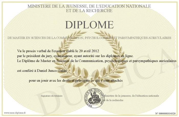 Envoyez par email votre Diplôme de Master en Sciences de la Communication, psychologiques et parsympathiques auriculaires personalisé