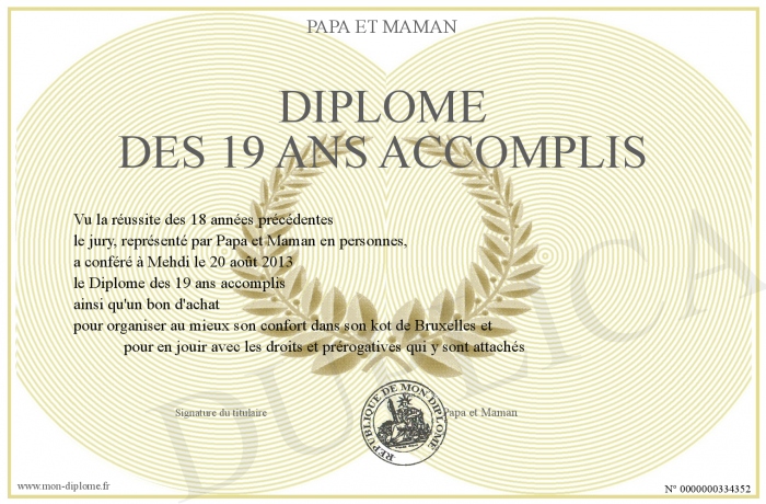 Envoyez par email votre Diplôme des 19 ans accomplis personalisé