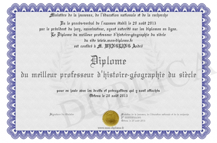 Envoyez par email votre Diplôme du meilleur professeur d'histoire-géographie du siècle personalisé