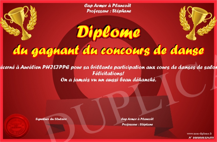Envoyez par email votre Diplôme du gagnant du concours de danse personalisé