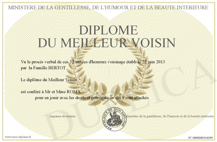 Envoyez par email votre Diplôme du meilleur voisin personalisé