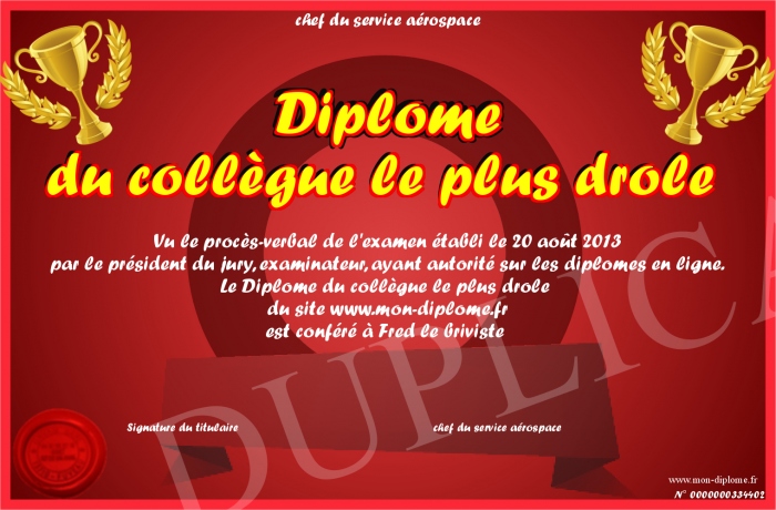 Envoyez par email votre Diplôme du collègue le plus drôle personalisé