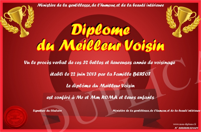 Envoyez par email votre Diplôme du Meilleur Voisin personalisé