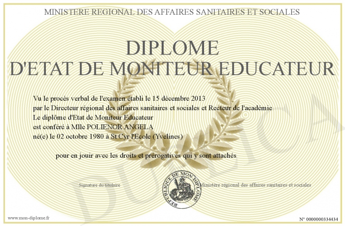 Envoyez par email votre Diplôme d'Etat de Moniteur Educateur personalisé