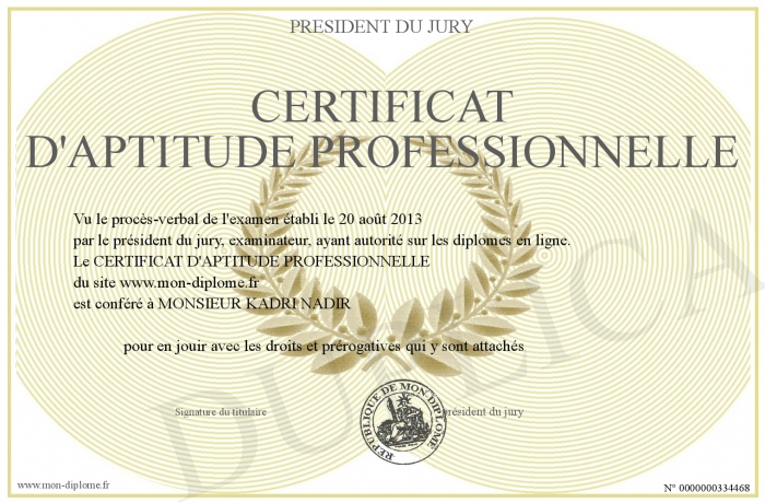 Envoyez par email votre CERTIFICAT D'APTITUDE PROFESSIONNELLE personalisé