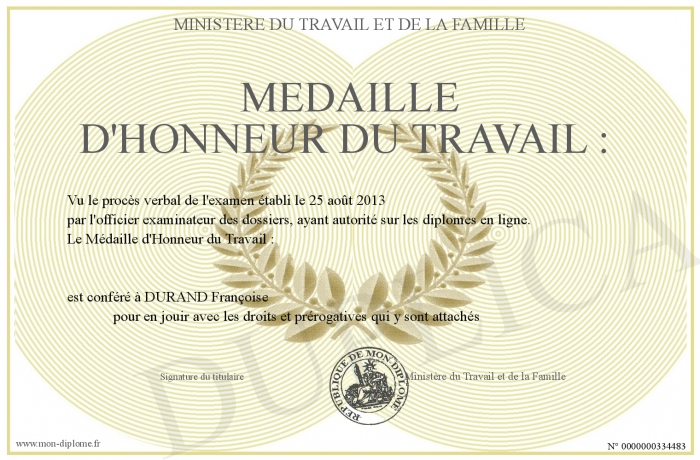 Envoyez par email votre Médaille d'Honneur du Travail : personalisé