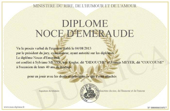 Envoyez par email votre Diplôme NOCE D'EMERAUDE personalisé