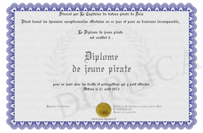 Envoyez par email votre Diplôme de jeune pirate personalisé