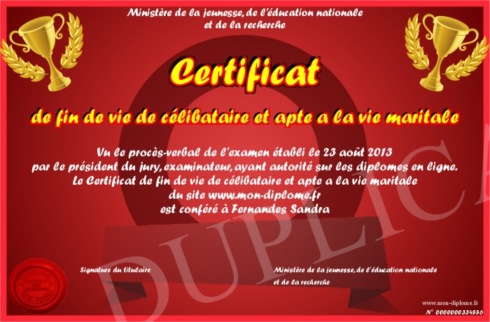 Envoyez par email votre Certificat de fin de vie de célibataire et apte a la vie maritale personalisé