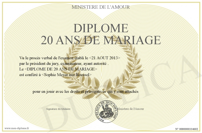 Envoyez par email votre Diplôme 20 ANS DE MARIAGE personalisé