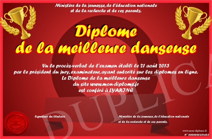 Envoyez par email votre Diplôme de la meilleure danseuse personalisé