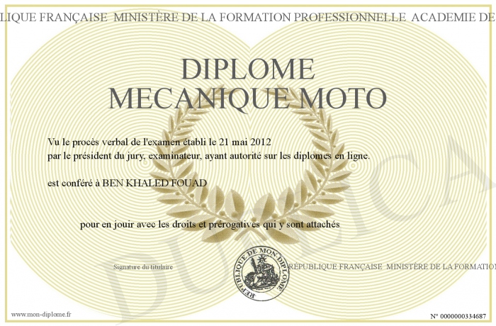 Envoyez par email votre Diplôme MECANIQUE MOTO personalisé