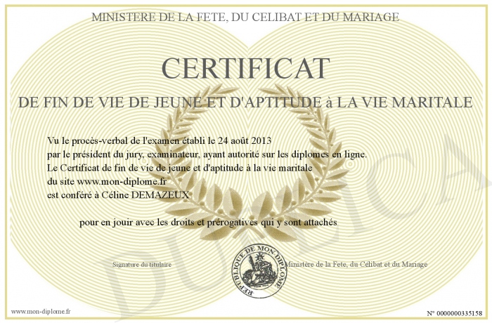 Envoyez par email votre Certificat de fin de vie de jeune et d'aptitude à la vie maritale personalisé